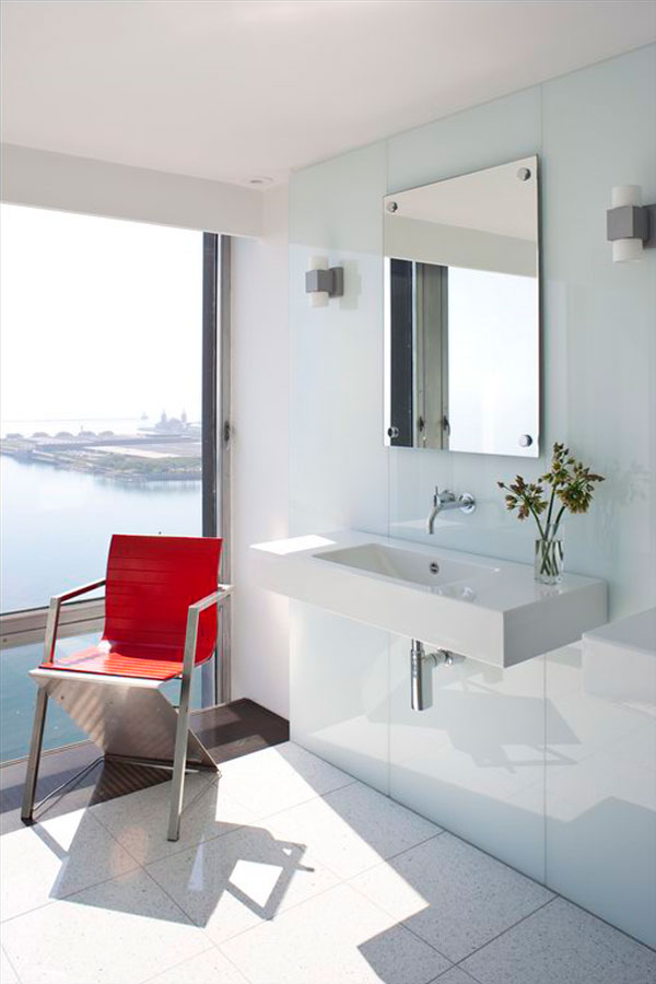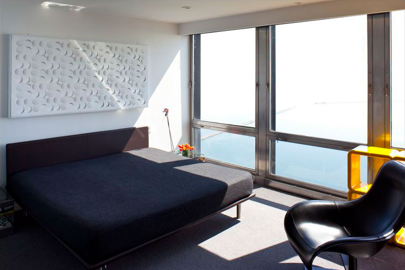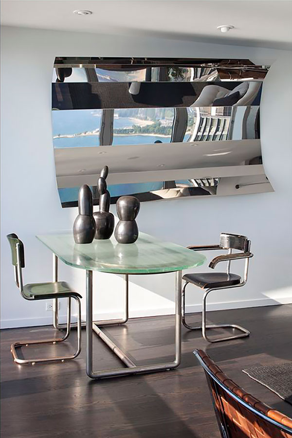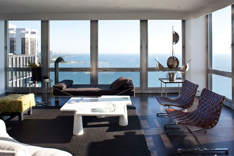 One half of the top floor, in a landmark lakefront high-rise designed by Ludwig Mies van der Rohe, this penthouse apartment was purchased to be a backdrop for the clients' collections of modern art and important vintage design. With walls of glass, the city and water views are dramatic and ever-changing; a vibrant downtown home for new "empty-nesters."