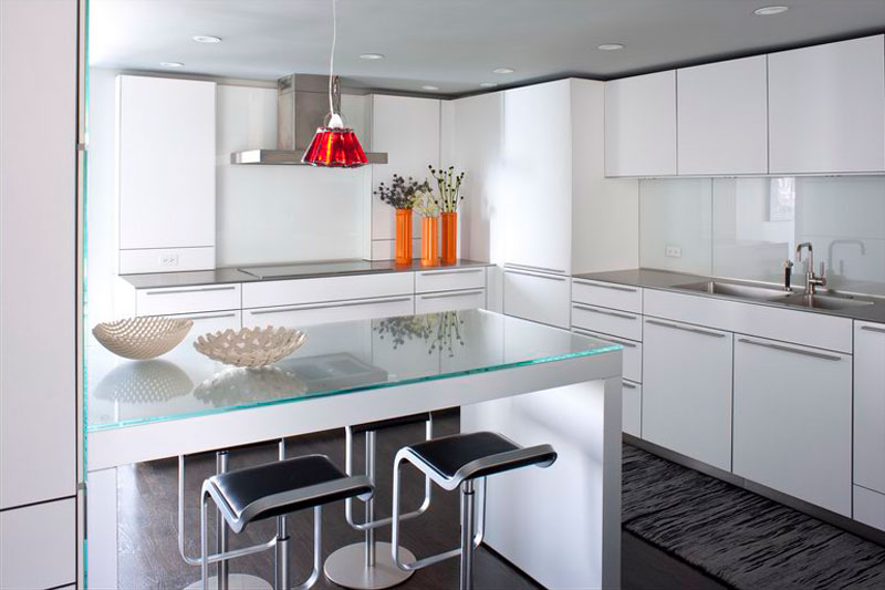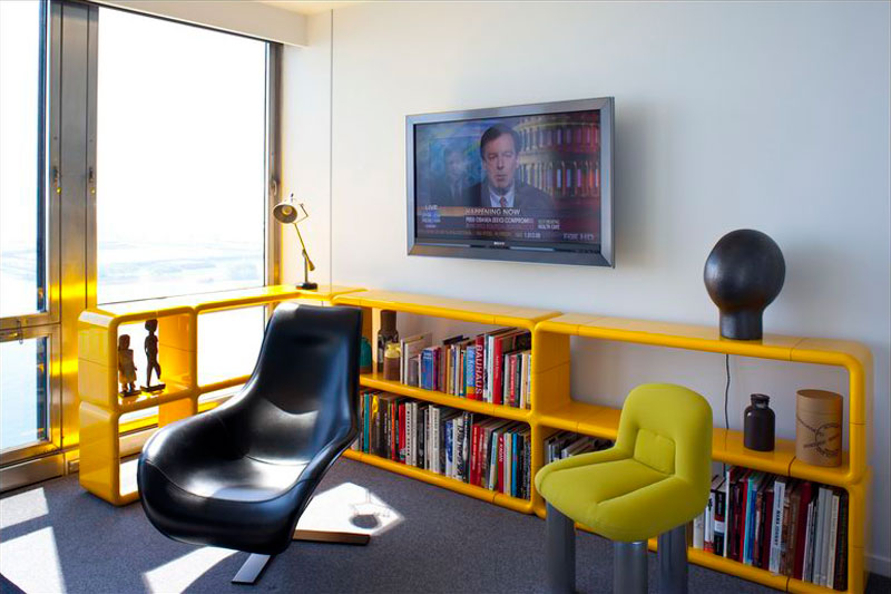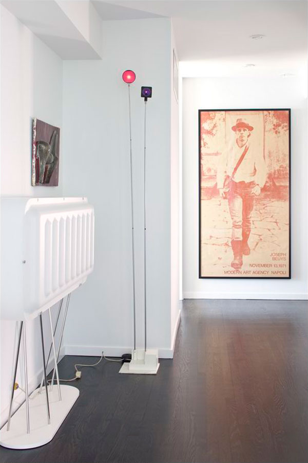 In the interest of having a light, open space which would respond to the changing sky, a color palette was developed using subtle shades of gray that relate to the surrounding glass, steel and stone. Many examples of important design in the client's collection were added with site-specific concerns in mind, including pieces by Andrea Branzi, Ettore Sottsass, Gio Ponti, Erik Levy, Ingo Maurer and Cini Boeri.